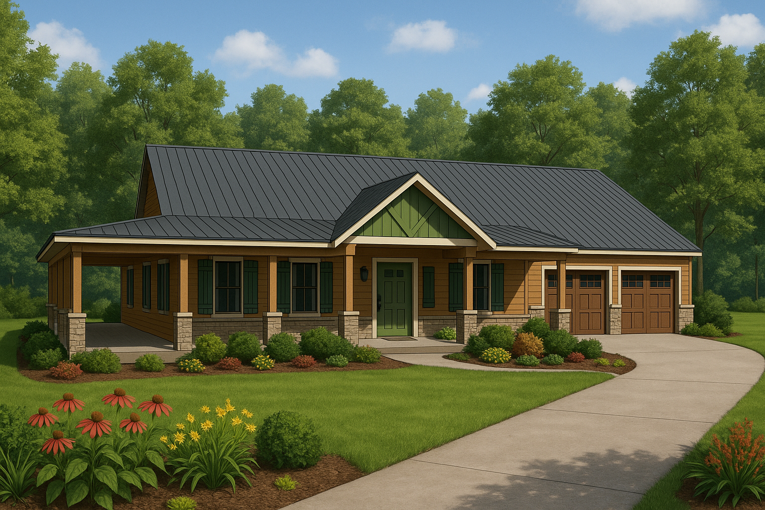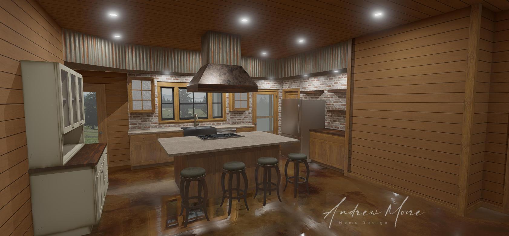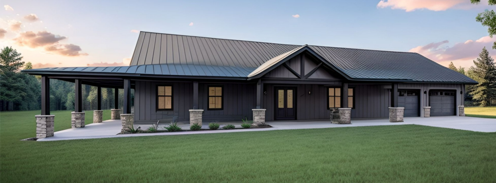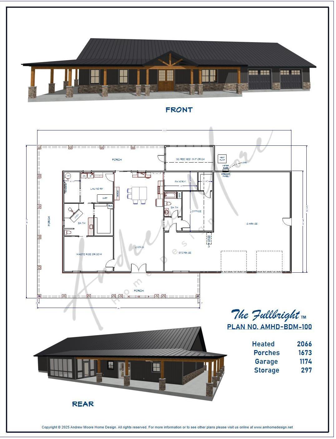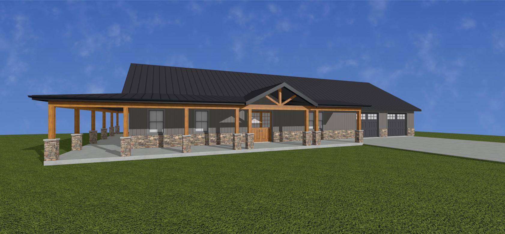 The Fulbrite is a single story, one bedroom, one office, 2 bath barndominium that can be customized for your family's needs and desires. This stock version has a master suite with large, custom corner shower, open-concept living, dining & kitchen. The wrap around porch connects to a screened in porch on the rear which can connect to the kitchen when customized. This plan features a large garage, large pantry and storage area. This plan can be built using a pole barn shell or metal building shell. See floor plan below along with the square footages and alternate exterior styles/materials.
