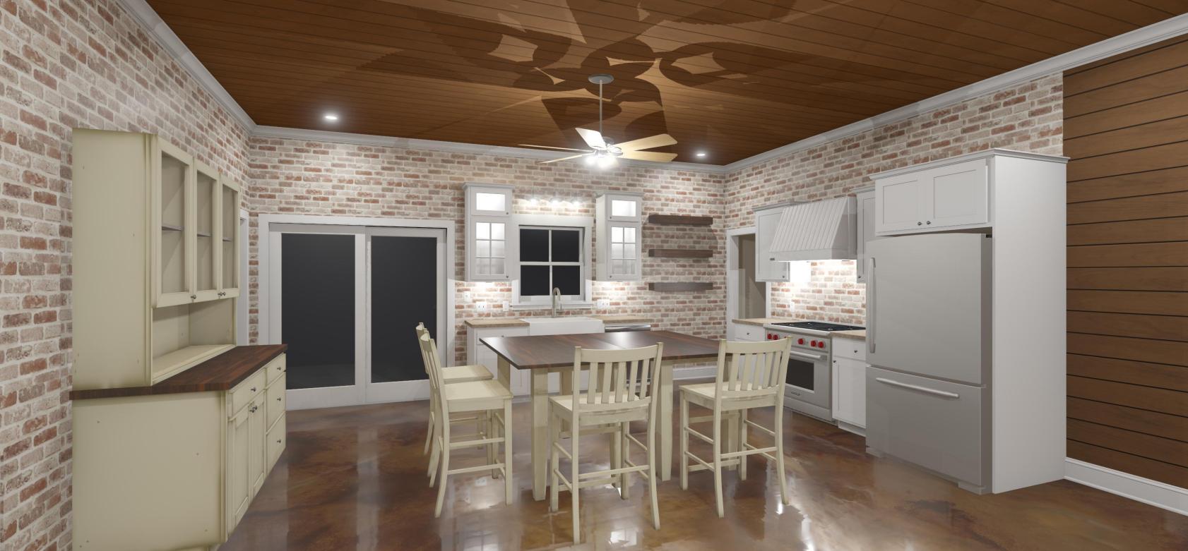 The Fulbrite is a single story, one bedroom, one office, 2 bath barndominium that can be customized for your family's needs and desires. This stock version has a master suite with large, custom corner shower, open-concept living, dining & kitchen. The wrap around porch connects to a screened in porch on the rear which can connect to the kitchen when customized. This plan features a large garage, large pantry and storage area. This plan can be built using a pole barn shell or metal building shell. See floor plan below along with the square footages and alternate exterior styles/materials.