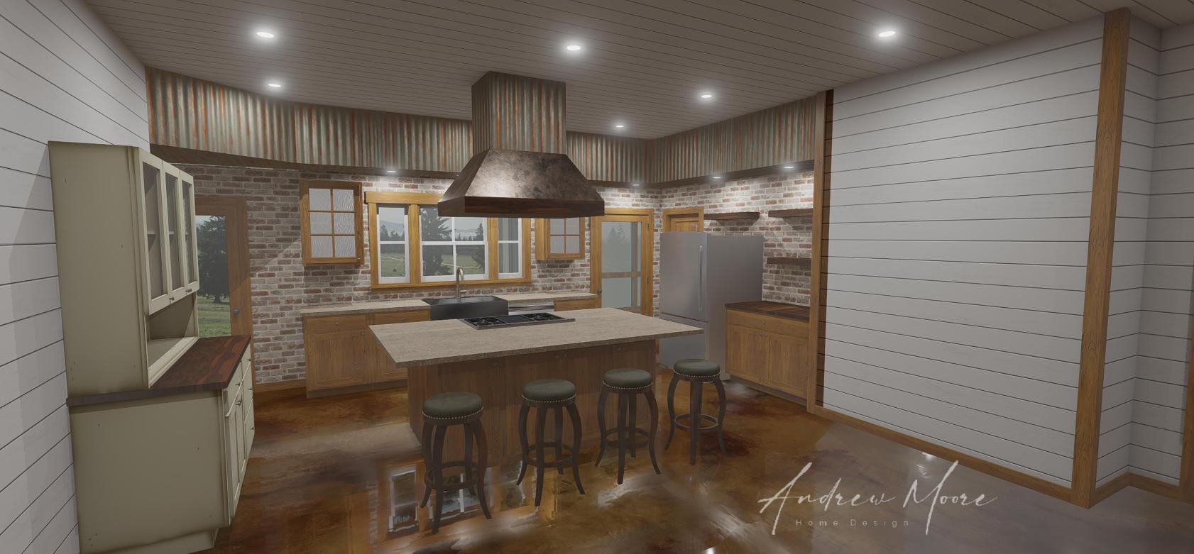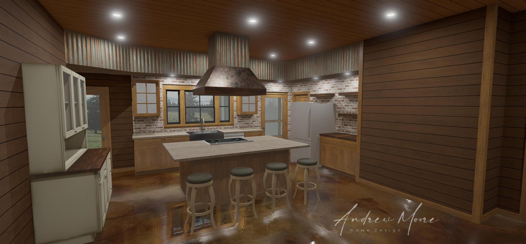 The Fulbrite is a single story, one bedroom, one office, 2 bath barndominium that can be customized for your family's needs and desires. This stock version has a master suite with large, custom corner shower, open-concept living, dining & kitchen. The wrap around porch connects to a screened in porch on the rear which can connect to the kitchen when customized. This plan features a large garage, large pantry and storage area. This plan can be built using a pole barn shell or metal building shell. See floor plan below along with the square footages and alternate exterior styles/materials.